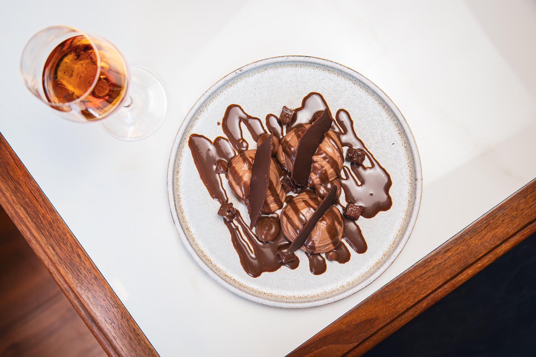 Chocolate en cinco texturas: mousse de chocolate Ghana, ganache de Santo Domingo, crujiente de Fleur de Cao, fudge brownie y cobertura de Nocilla.