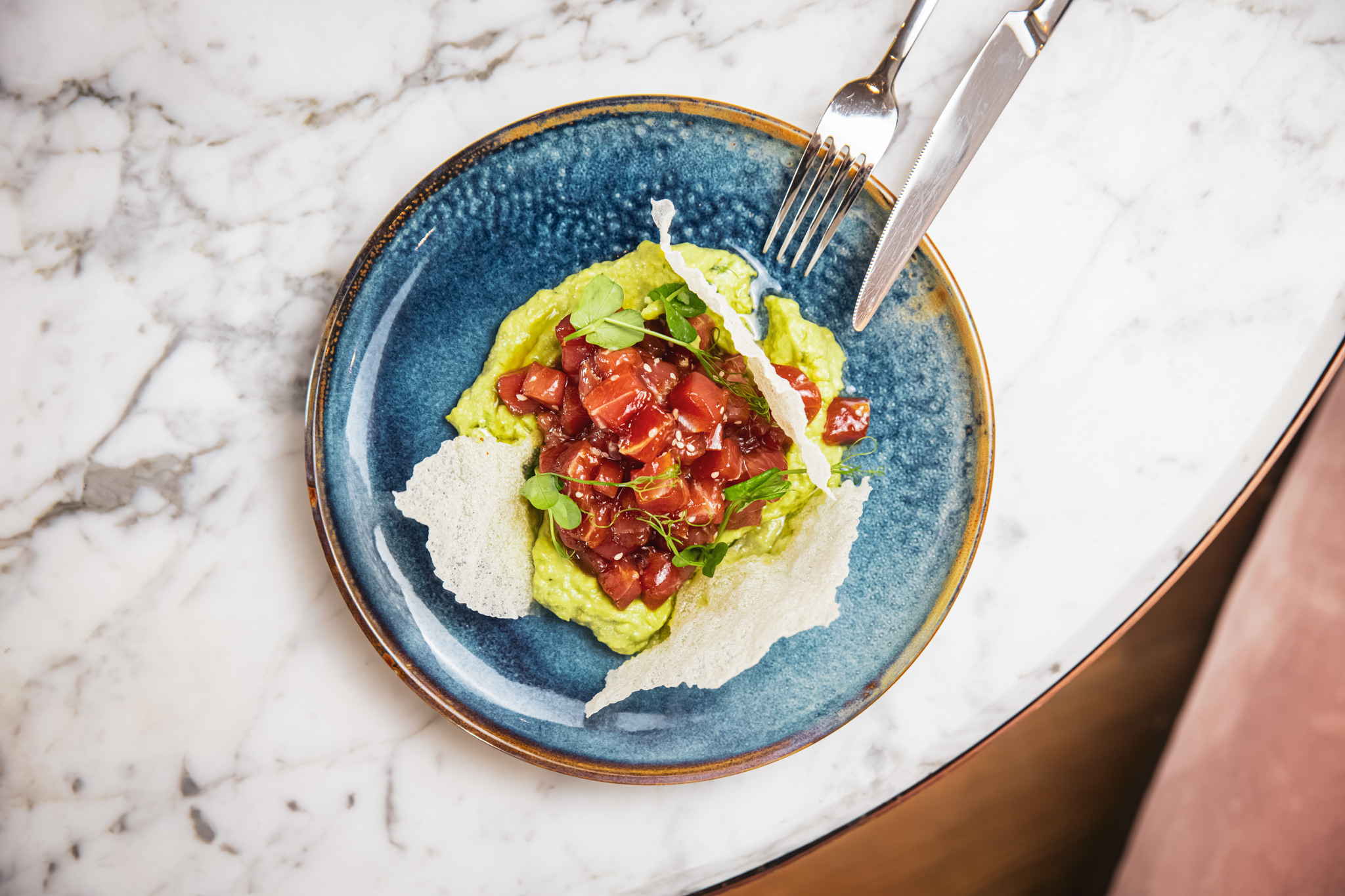 Tartar de atún rojo Balfegó, cremoso de aguacate, papel de arroz.