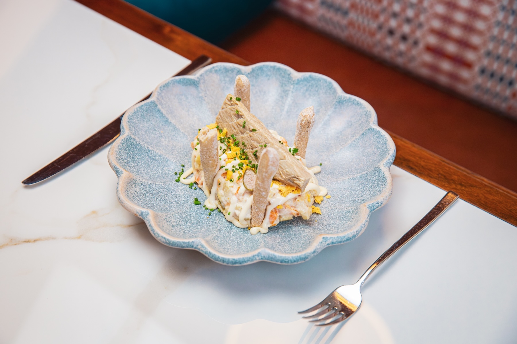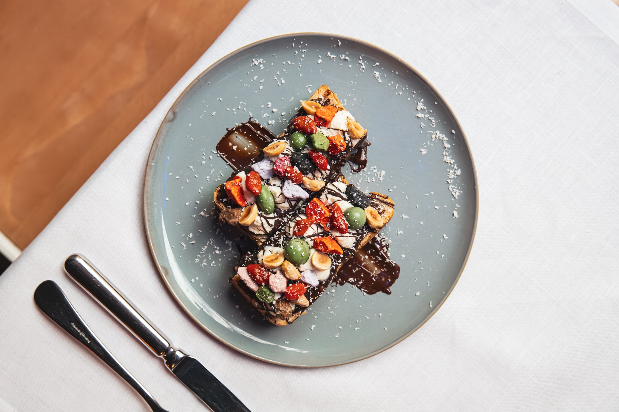Nocilla —marca icónica vinculada a la memoria colectiva de la merienda en España— se reinterpreta en clave gastronómica. Su presencia supone trasladar un producto popular al universo de la alta cocina hotelera, explorando nuevas aplicaciones y formatos.